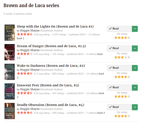 As a refresher, I'm re-posting the series I chose along with my updated review links. For the Goodreads series page screen shot, please scroll to end of the post.