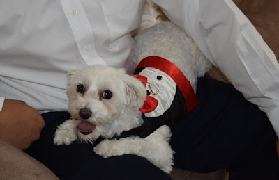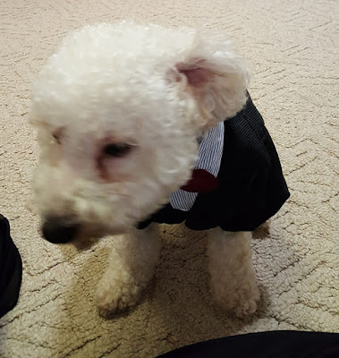 Here's Yogi in his cute little doggie tux, as he makes himself comfortable in my cousin's lap.