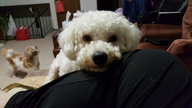 Meanwhile, here's a pick of a pup with his head propped on my leg as he watches me munch on a cracker.